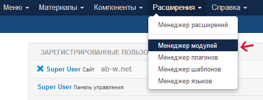 6. В меню админки открываем Расширения → Менеджер модулей: