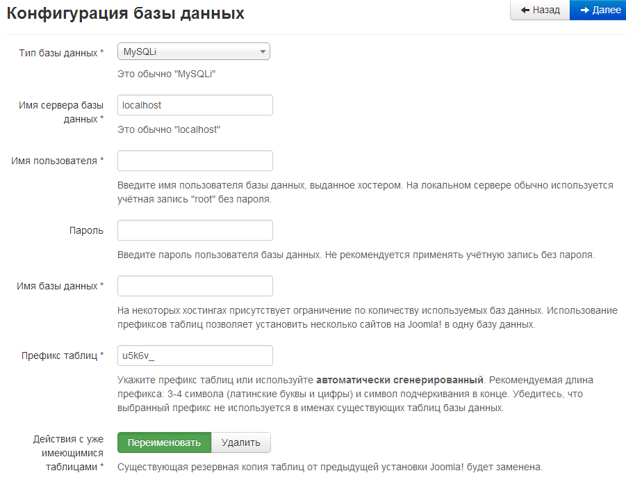 На этом этапе мы произведем настройки подключения к базе данных на стороне сервера хостинга. Другими словами, нам предстоит ввести в соответствующие поля формы свои данные, а именно: имя пользователя, пароль и имя базы данных – остальные поля остаются без изменений, то есть: Тип базы данных → MySQLi; Имя сервера базы данных → localhost; Префикс таблиц → символы; Действия с уже имеющимися таблицами → Переименовать. Но сначала необходимо создать имя пользователя, пароль, имя базы данных, а затем завершить процесс конфигурации на текущей странице мастера установки.