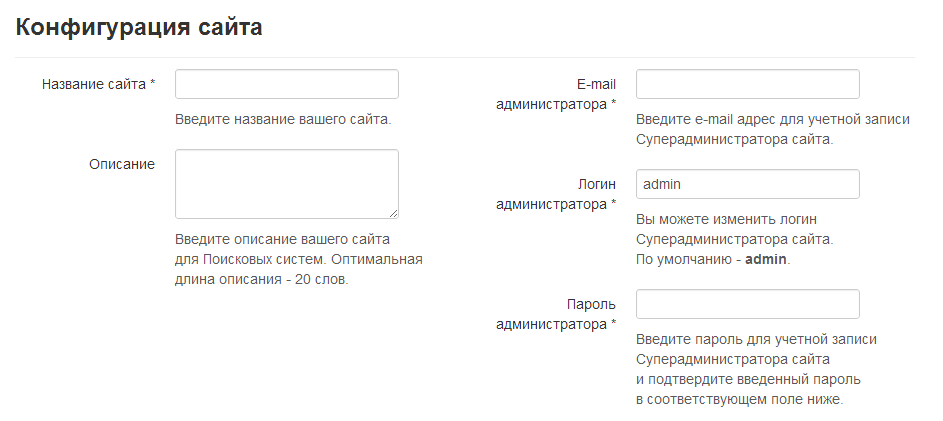 На странице, которая открылась нужно ввести название и описание сайта. В принципе, там указано, что куда печатать. Прочтите внимательно и заполните необходимые поля. Введенные вами данные доступа к системе будут логином и паролем, которые вы сможете использовать для авторизации в панели управления сайтом после завершения процесса установки Джумла на хостинг.