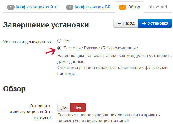 Завершаем процесс. Устанавливаем демо-данные с изучением Joomla или другие: