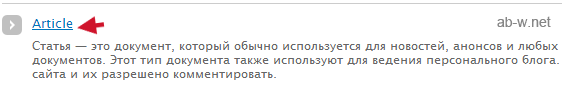 На следующем этапе у нас спросят, какого типа содержимое мы собираемся публиковать. И сразу же предлагают ознакомиться с всевозможными видами материалов. Так если мы собираемся создавать новости, анонсы и планируем делать это регулярно, то есть планируем завести себе персональный электронный дневник, он же блог – нам подойдет статья. По умолчанию, документы этого формата в Друпал отображаются на главной странице сайта и к ним разрешены комментарии. Если нам нужен статичный контент, такой, который не будет изменяться часто, то нас вполне устроит страница. Пример подобных страниц: страницы «О сайте» или «Контакты». Также следует учесть и то, что по умолчанию, документы такого типа не выводятся на главную страницу Друпал сайта и комментарии к ним отключены. Хотя, это можно изменить.