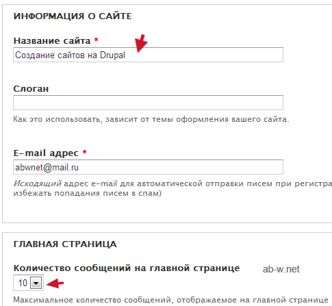 2. На открывшейся странице мы имеем возможность изменить название сайта, которое указали при установке Друпал или обозначить количество сообщений, выводимых на главной странице: