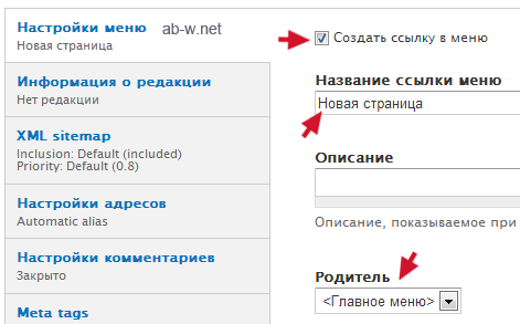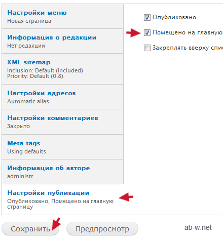 После изменения настроек жмем Сохранить. В итоге, при публикации статей и страниц, у меня все осталось по-прежнему: после заголовка следует название сайта. Видимо модуль мета-тегов понадобится нам для другого. Кстати, при добавлении страниц (Basic page), они не отображаются на главной, если, конечно, не отметить соответствующий пункт в настройках еще при публикации: