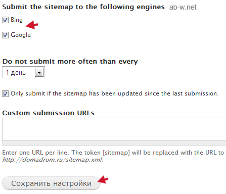 отмечаем, чтобы наша карта сайта всякий раз, как появляется новая публикация, отправлялась на индексацию к поисковым машинам Google и Bing; сохраняем настройки: