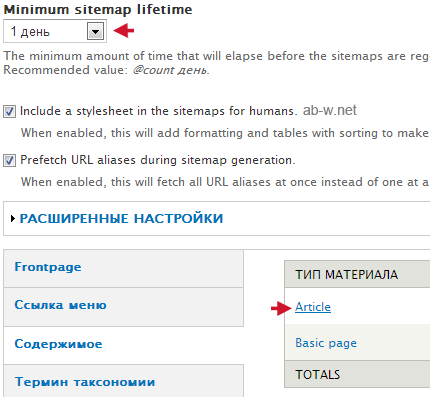 производим основные настройки. Например, чтобы изменить приоритет статьи при ее индексации поисковиками с 0.5 (стоит по умолчанию) до 0.8 или 1, кликаем на Article: