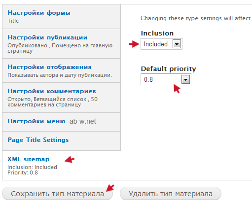 и попадаем на страницу настроек параметров статьи, где переходим во вкладку XML sitemap, включаем параметр, обозначаем приоритет и сохраняем тип материала: