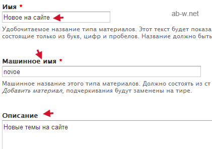 Например, мы решили создать тип специально для материалов, затрагивающих какую-нибудь новую тему для нашего сайта. Значит имя материалу мы дадим соответствующее. Машинное имя пришлось прописывать латинскими буквами вручную, так как в автоматическом режиме система это выполняет только для англоязычных имен. Я также добавил описание материала: