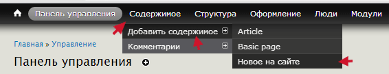 Открыв тип материала способом, показанным на иллюстрации выше, вы окажетесь в панели управления, где можно произвести множество дополнительных настроек: редактирование, управление полями, управление отображением, поля комментария, отображения комментария. Не стал подробно останавливаться на этом, для знакомства с системой хватит и того, что изложил вверху, а с остальным, надеюсь, вы со временем сами разберетесь. Мы имеем дело с Drupal, возможности которого очень велики, помните это и идите вперед.