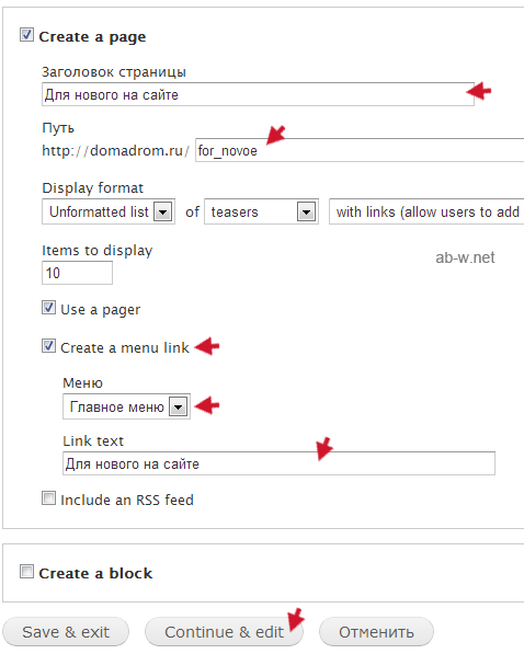 Еще ниже пишем заголовок, произвольный путь, создаем ссылку в главном меню, текст которой вы можете изменить, и продолжаем редактирование: