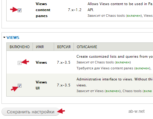 7. В самом низу страницы находим наш Views. Его надо включить, отметив чекбоксы: