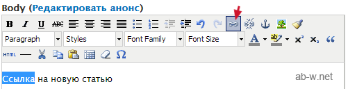 В результате некоторых усилий мы имеем визуальный редактор со множеством функций. Когда вы будете добавлять новые статьи, страницы или содержимое другого типа и захотите указать гиперссылку, первым делом выделите мышкой тот текст, который будет ссылкой, а потом нажмите на соответствующий данному действию значок: