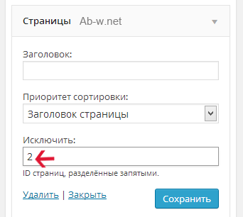 Вводим идентификатор страницы, которую хотим исключить из списка. В нижней колонке блога, под одноименным заголовком мы имеем две страницы: первая была добавлена нами, а вторая → Пример страницы – по умолчанию. Наведите указатель мыши на Пример страницы, чтобы в левом нижнем углу браузера отобразился идентификатор, в моем случае – это id=2. Теперь в панели админа блога, во вкладке Страницы, в поле Исключить вводим значение идентификатора, то есть 2 и жмем Сохранить.